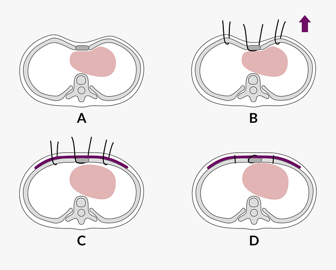 Dr. Wenlin Wang developed the Wang procedure in 2018. It is a minimally invasive way to do surgery for pectus excavatum. The Wang procedure differs from the traditional Nuss procedure in that it places the steel bar on the surface of the depressed bony structure. Steel wires are threaded through the sternum and rib cartilages to lift the chest wall that has sunk in, and the midsection of the bar is secured to the sternum. This method does not enter the chest cavity, which avoids the risk of heart damage and lets bones grow normally. It is safe for children under five years old.